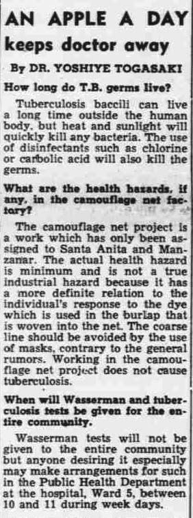 Originally from San Francisco, Yoshiye Togasaki was a practicing doctor before the bombing of Pearl Harbor. After her forced removal from the Bay Area, Togasaki was sent to the Manzanar concentration camp. She fought for proper sanitation after finding a “real public health nightmare,” and demanded the segregation of tuberculosis patients within the camp.